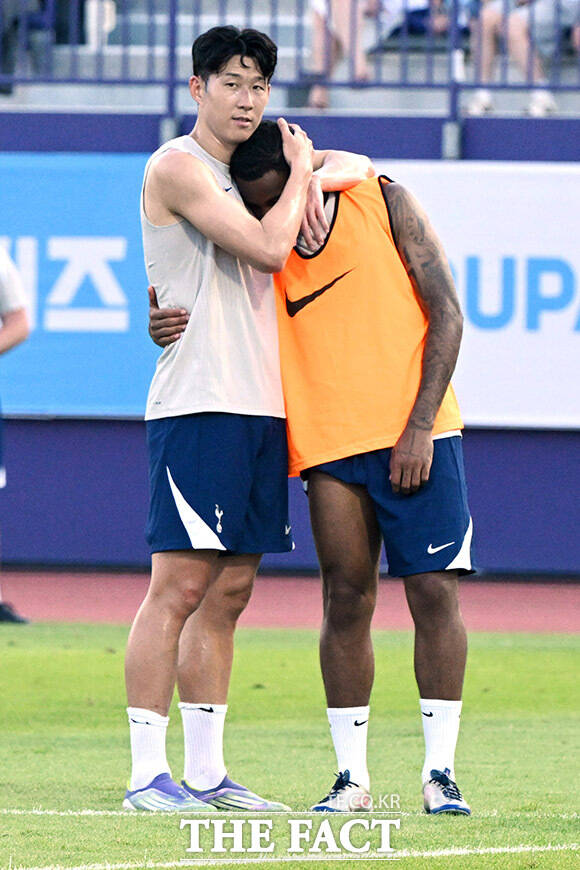 [더팩트ㅣ안양종합운동장=남용희 기자] 손흥민(왼쪽)이 2일 오후 경기도 안양시 안양종합운동장에서 열린 2025 쿠팡플레이 시리즈 토트넘 오픈 트레이닝에서 훈련 중 윌손 오도베르를 안아주고 있다.