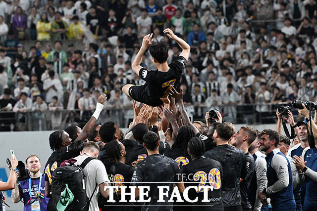 [더팩트ㅣ서울월드컵경기장=남용희 기자] 토트넘 훗스퍼와 뉴캐슬 유나이티드의 쿠팡플레이 시리즈 2경기가 3일 오후 서울 마포구 서울월드컵경기장에서 열린 가운데 손흥민이 경기를 마친 뒤 동료들의 헹가레를 받고 있다.