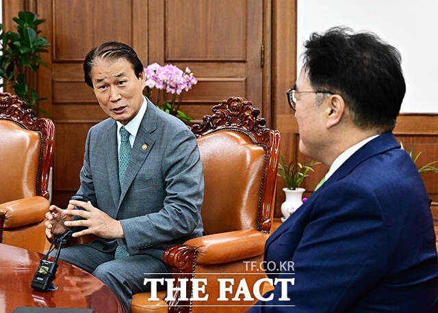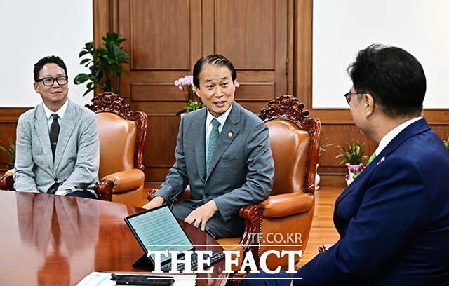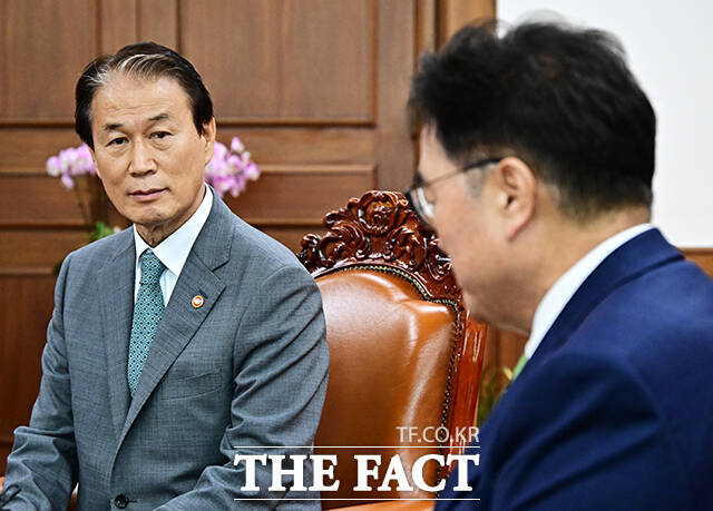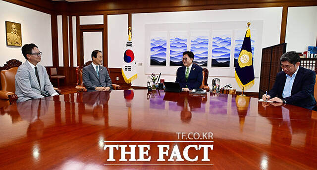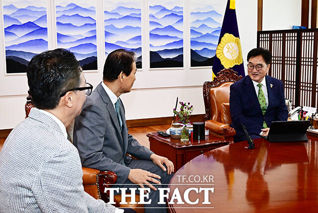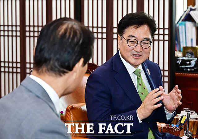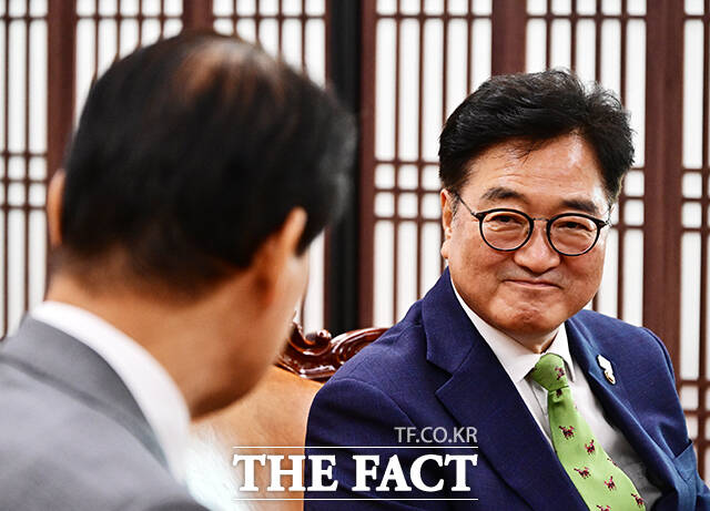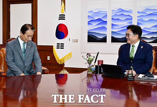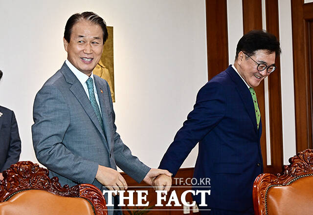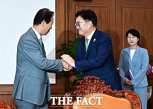 [더팩트ㅣ국회=배정한 기자] 우원식 국회의장이 4일 오전 서울 여의도 국회에서 권오을 국가보훈부 장관(왼쪽)을 접견하며 기념사진 촬영을 하고 있다.