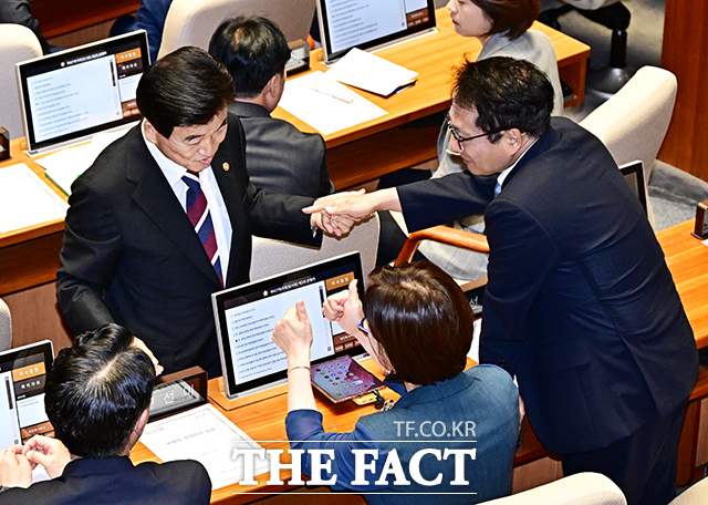 [더팩트ㅣ국회=배정한 기자] 정동영 통일부 장관이 4일 오후 서울 여의도 국회에서 열린 본회의에 참석해 진선미 더불어민주당 의원과 인사를 하고 있다.