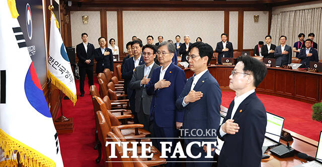 [더팩트ㅣ임영무 기자] 김민석 국무총리(오른쪽 네 번째) 및 국무위원들이 5일 오전 서울 종로구 정부서울청사에서 열린 국무회의 시작을 앞두고 국민의례를 하고 있다.darkroom@tf.co.kr사진영상기획부 photo@tf.co.kr