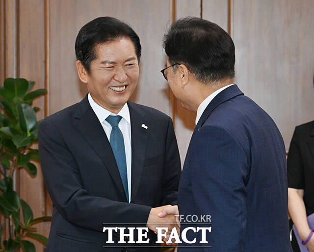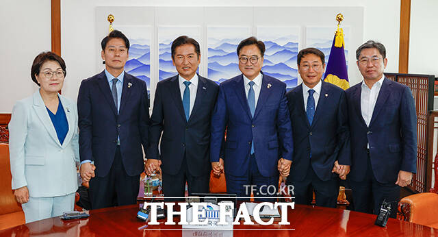 [더팩트ㅣ국회=박헌우 기자] 정청래 더불어민주당 신임 대표(왼쪽)가 5일 오전 서울 여의도 국회에서 우원식 국회의장을 예방해 기념촬영을 하고 있다.