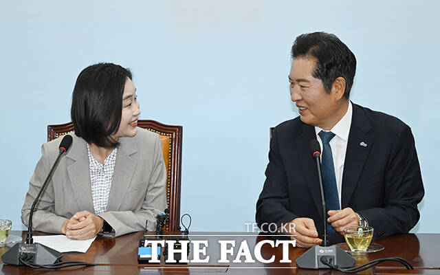이날 정청래 더불어민주당 신임 대표는 "당이 다르다 보니 때로는 선거에서 경쟁하기도 하지만 지난 윤석열 검찰 독재 정권을 물리쳐야 하는 입장에서는 항상 한 길에서 한뜻으로 같이 해 주신 것 같다"며 "그 부분에 대해 감사드린다"고 전했다.