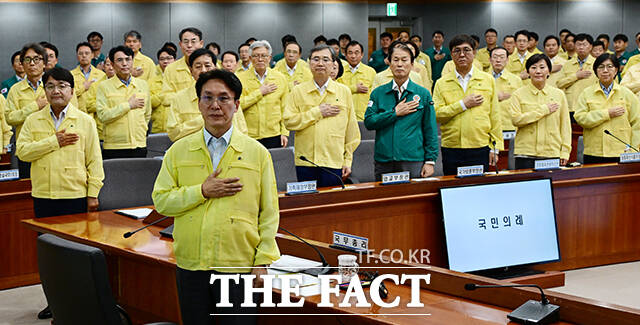[더팩트ㅣ임영무 기자] 김민석 국무총리와 구윤철 부총리 겸 기획재정부 장관 등 국무위원이 5일 오후 서울 종로구 정부서울청사 별관 국제회의실에서 열린 을지연습 준비보고회의에 참석해 국기에 대한 경례를 하고 있다.