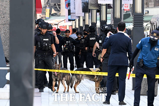 [더팩트ㅣ서예원 기자] 5일 오후 서울 중구 명동 신세계백화점 본점에 폭발물을 설치했다는 협박 글이 인터넷 커뮤니티에 올라와 경찰특공대 등이 폭발물 수색을 마치고 이동하고 있다.