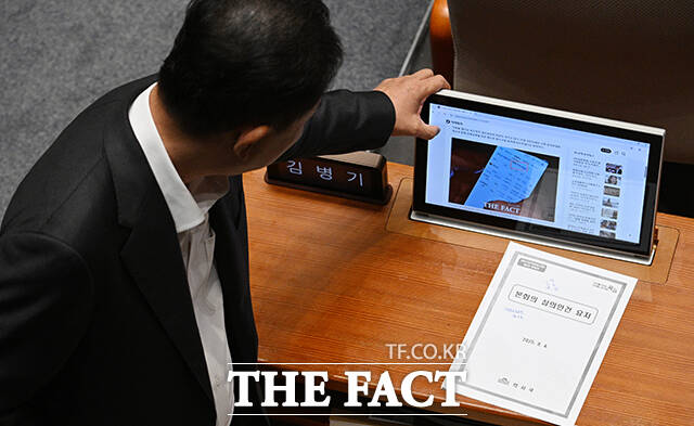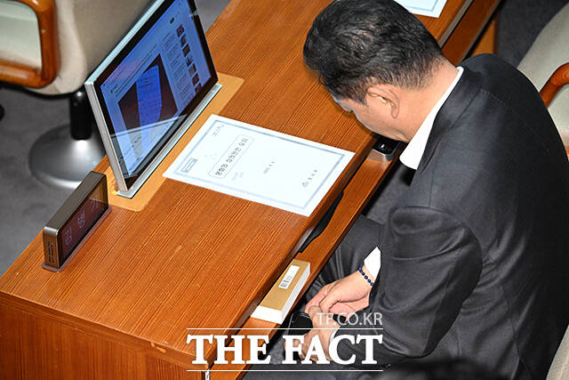 [더팩트ㅣ국회=박헌우 기자] 김병기 더불어민주당 의원이 5일 오후 서울 여의도 국회에서 열린 본회의에 참석해 휴대전화를 확인하고 있다.