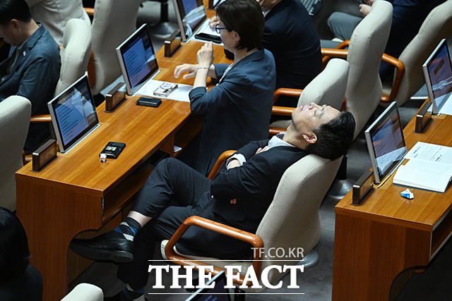[더팩트ㅣ국회=박헌우 기자] 김영호 더불어민주당 의원이 5일 오후 서울 여의도 국회에서 열린 본회의에 참석해 눈을 감고 있다.