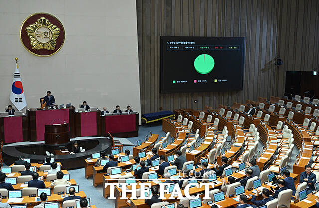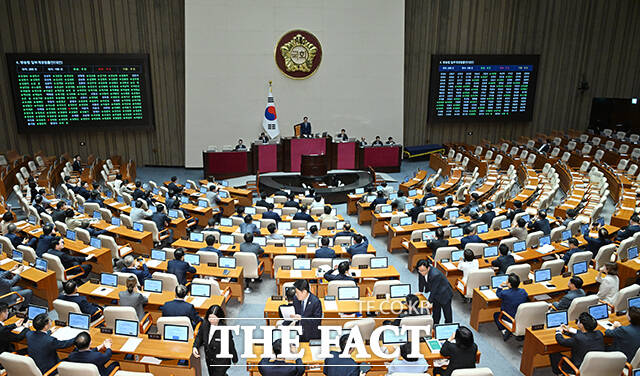 [더팩트ㅣ국회=박헌우 기자] 5일 오후 서울 여의도 국회에서 열린 본회의에서 방송법 일부개정법률안(대안)이 가결되고 있다.