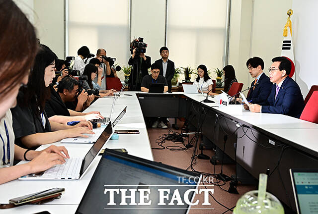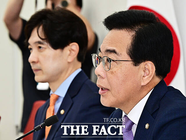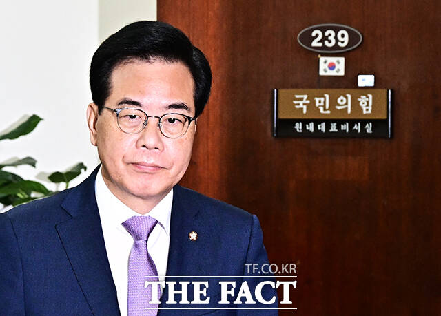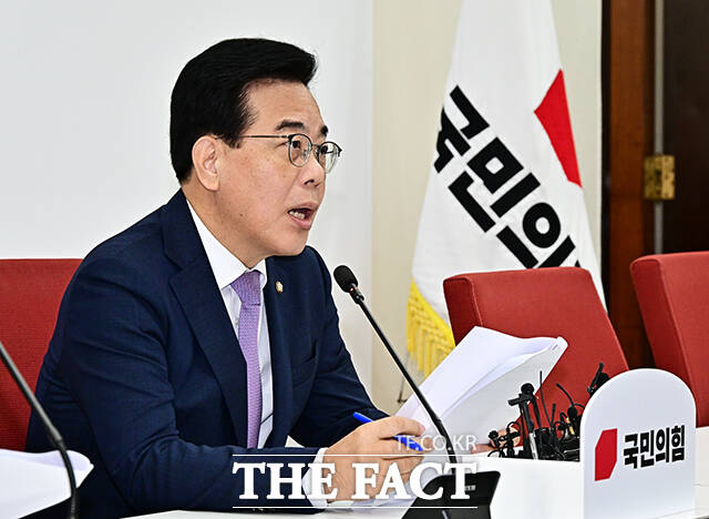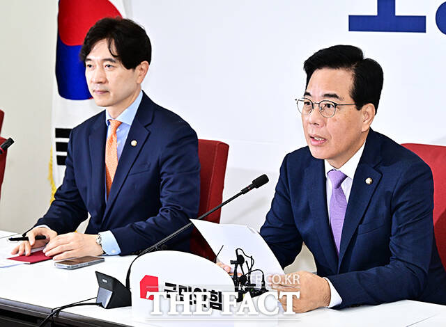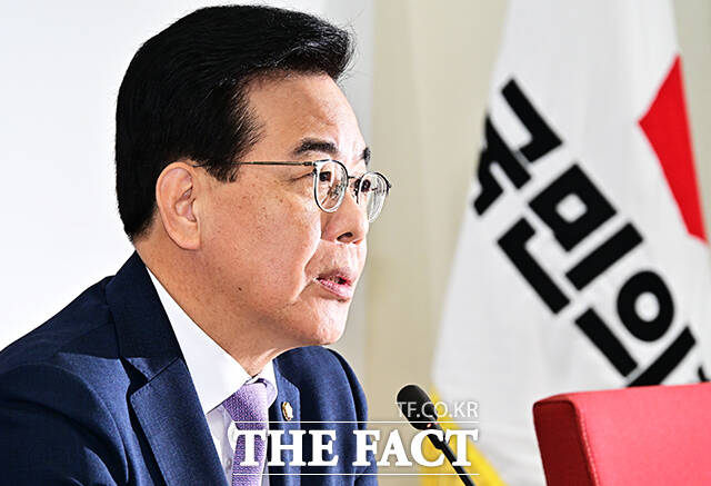 [더팩트ㅣ국회=배정한 기자] 송언석 국민의힘 비상대책위원장 겸 원내대표가 6일 오전 서울 여의도 국회에서 기자간담회를 열고 발언을 하고 있다.
