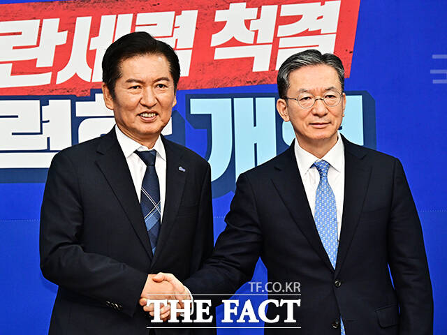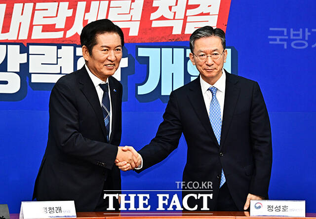 [더팩트ㅣ국회=배정한 기자] 정청래 더불어민주당 대표(왼쪽)가 6일 오전 서울 여의도 국회에서 정성호 법무부 장관을 접견하며 기념사진 촬영을 하고 있다.