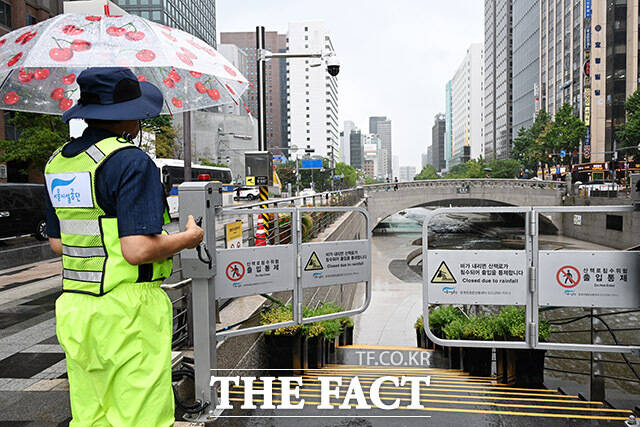 [더팩트ㅣ남용희 기자] 전국 대부분 지역에 많은 비가 내리고 있는 6일 오후 서울 종로구 청계천 산책로를 관계자가 통제하고 있다.