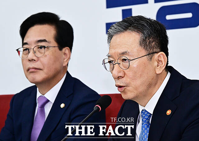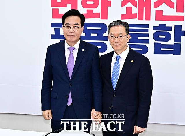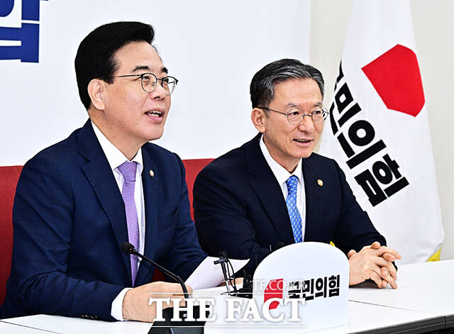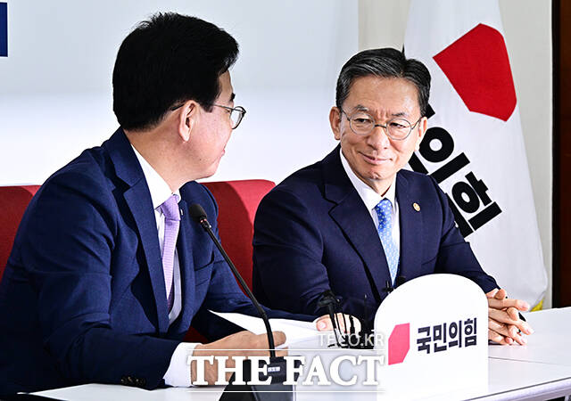 [더팩트ㅣ국회=배정한 기자] 송언석 국민의힘 비상대책위원장 겸 원내대표(왼쪽)가 6일 오후 서울 여의도 국회에서 정성호 법무부 장관을 접견하며 인사말을 하고 있다.