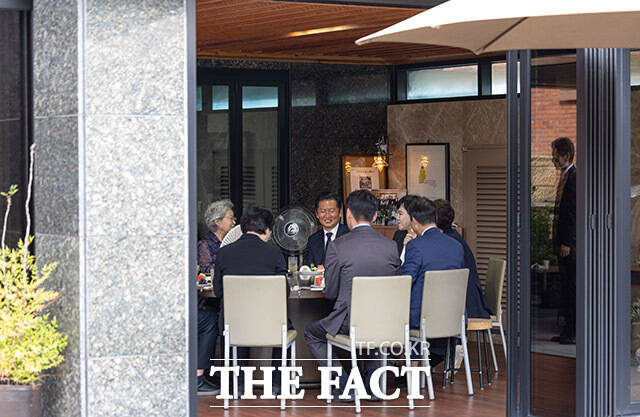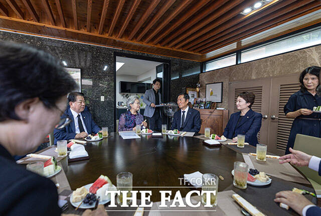 이날 정 대표는 노무현 전 대통령 묘역을 찾아 참배한 뒤 권양숙 여사를 예방했다. 정 대표와 최고위원들은 사저에서 권 여사를 만나 차담을 나누고, 권 여사는 정 대표와 최고위원들한테 부채를 선물했다.