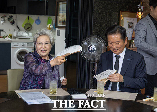 정청래 대표에게 부채 선물한 권양숙 여사 [TF사진관]