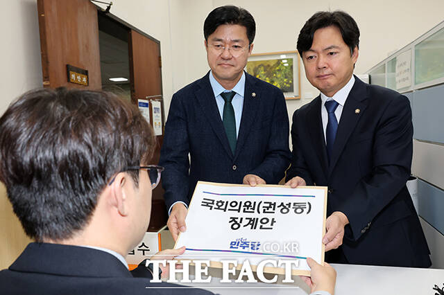 [더팩트ㅣ국회=남윤호 기자] 더불어민주당 박상혁 원내소통수석과 김현정 원내대변인이 8일 오전 서울 여의도 국회에서 권성동 국민의힘 의원에 대한 '징계안'을 의안과에 제출하고 있다.