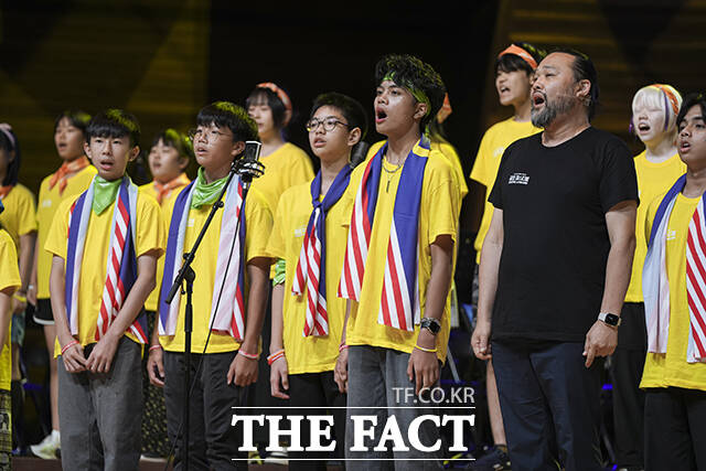 [더팩트ㅣ서예원 기자] 일본·말레이시아·태국 해외 청소년 합창단과 성악가 사무엘 윤(오른쪽)이 7일 강원도 평창 알펜시아리조트 뮤직텐트에서 열린 2025 꿈의 예술단 합동캠프 '꿈의 페스티벌'의 합동공연 '나의 내일을'에서 '브리지 오버 트러블드 워터(Bridge over troubled water)'를 합창하고 있다.