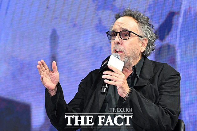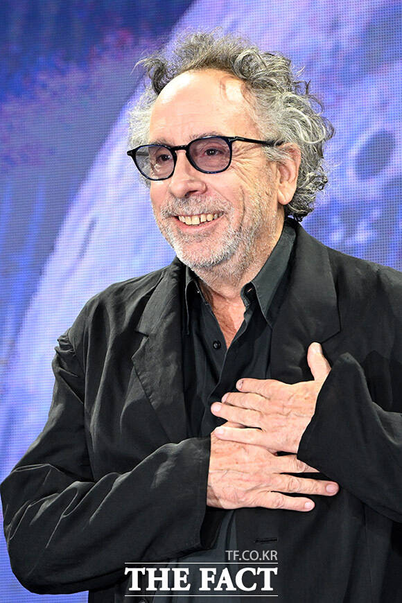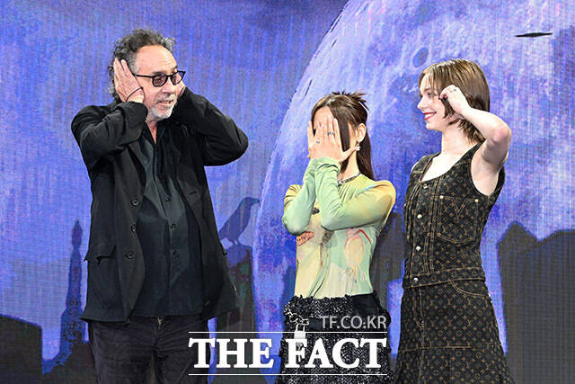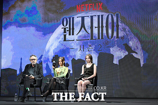 [더팩트ㅣ남용희 기자] 팀 버튼 감독과 배우 제나 오르테가, 에마 마이어스(왼쪽부터)가 11일 오전 서울 종로구 포시즌스 호텔 서울에서 열린 넷플릭스 시리즈 '웬즈데이 시즌2' 기자간담회에 참석해 포즈를 취하고 있다.