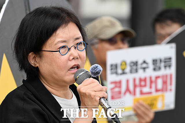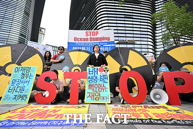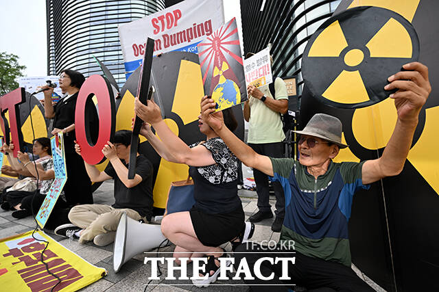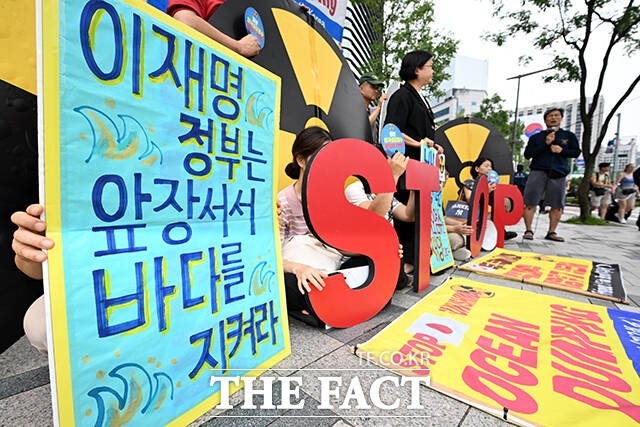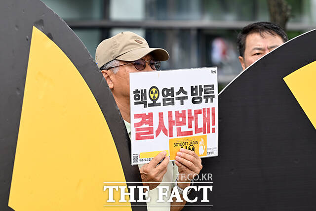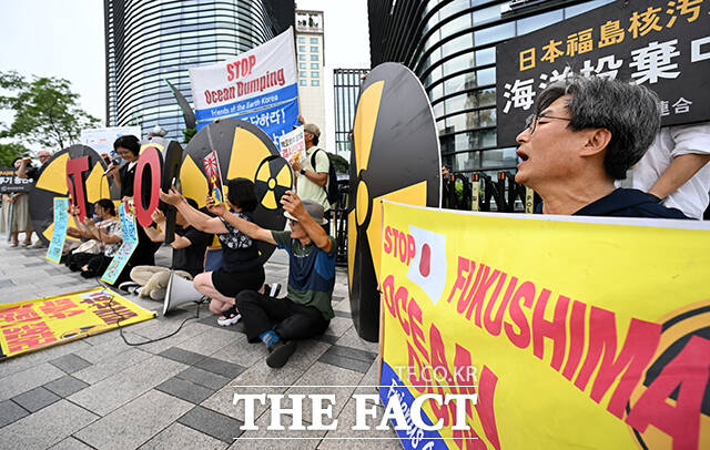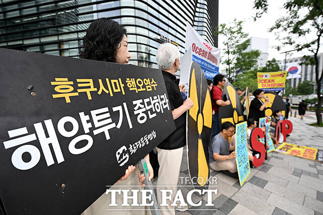 [더팩트ㅣ서예원 기자] 환경보건시민센터와 환경운동연합 등 시민단체가 11일 오전 서울 종로구 주한일본대사관 앞에서 일본 고이즈미 신지로 농림상 방한 및 한일 정상회담 관련 '후쿠시마 핵폐수 해양투기 중단' 촉구 기자회견을 열고 손피켓을 들어보이고 있다.