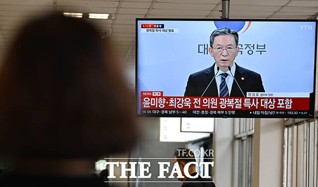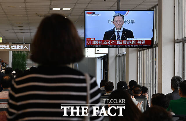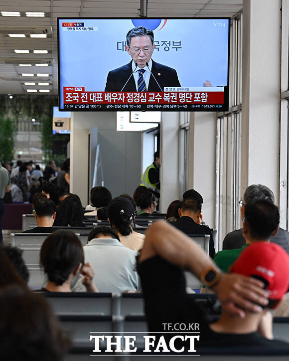 [더팩트ㅣ박헌우 기자] 11일 오후 서울 서초구 서울고속버스터미널에서 시민들이 광복절 특별사면 관련 브리핑을 시청하고 있다.
