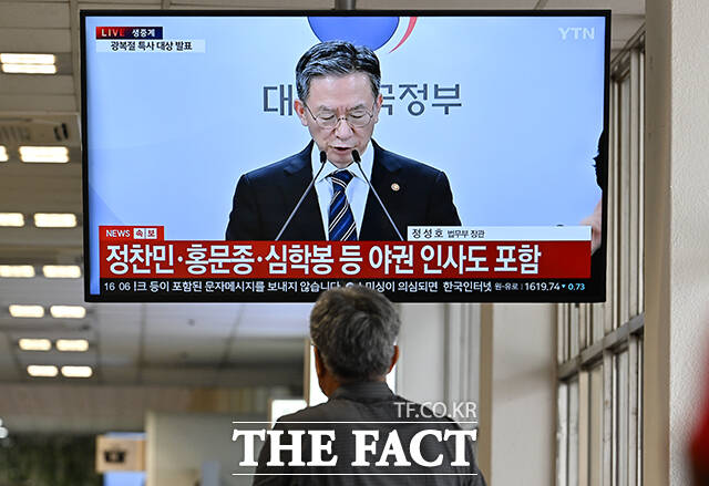11일 오후 서울 서초구 서울고속버스터미널에서 시민들이 광복절 특별사면 관련 브리핑을 시청하고 있다. /박헌우 기자