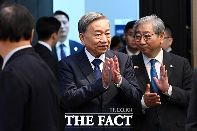 [더팩트ㅣ남용희 기자] 또 럼 베트남 공산당 서기장(가운데)이 11일 오후 서울 서대문구 연세대학교 경영관에서 열린 특별강연 및 명예정치학박사 학위수여식에 참석하고 있다.