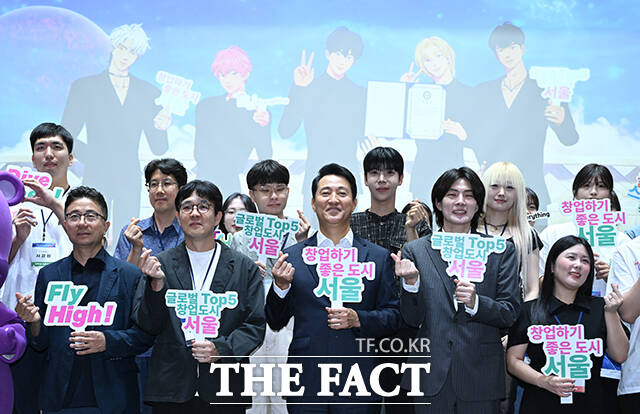 [더팩트ㅣ장윤석 기자] 오세훈 서울시장을 비롯한 참석자들이 12일 오전 서울 중구 서울시청에서 열린 '2025 스타트업 서울 홍보대사 위촉식'에서 버추얼 그룹 플레이브와 기념 촬영을 하고 있다.
