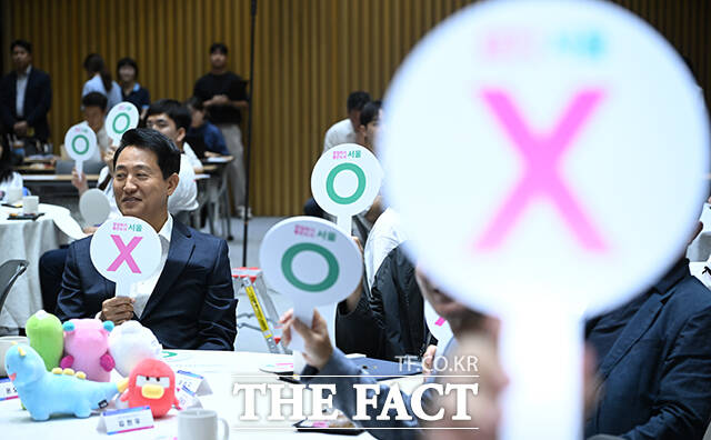 [더팩트ㅣ장윤석 기자] 오세훈 서울시장이 12일 오전 서울 중구 서울시청에서 열린 '2025 스타트업 서울 홍보대사 위촉식'에서 OX퀴즈를 하고 있다.
