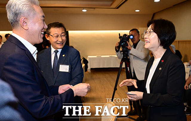 [더팩트ㅣ임영무 기자] 이스란 보건복지부 1차관(오른쪽)이 12일 오후 서울 종로구 정부서울청사에서 열린 제4차 장기요양위원회에 참석해 참석자들과 인사를 나누고 있다. darkroom@tf.co.kr사진영상기획부 photo@tf.co.kr