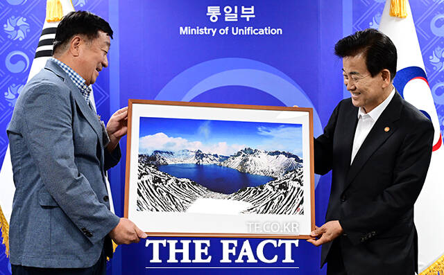 [더팩트ㅣ임영무 기자] 정동영 통일부 장관(오른쪽)이 12일 오후 서울 종로구 정부서울청사에서 열린 경협·교역·금강산 기업 단체와의 면담에서 북한에서 찍은 백두산 사진을 선물받고 있다.