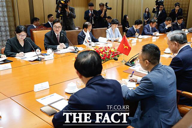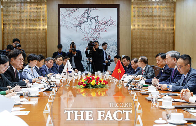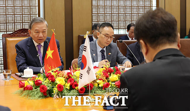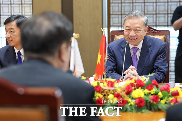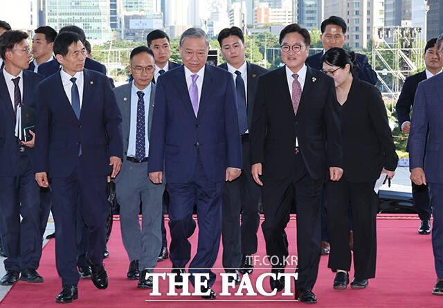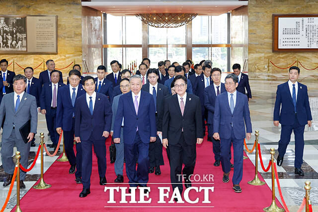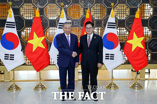 [더팩트ㅣ국회사진기자단] 우원식 국회의장(오른쪽)이 12일 서울 여의도 국회에서 이재명 정부 출범 후 첫 국빈 자격으로 방한한 또 럼 베트남 공산당 중앙집행위원회 서기장(왼쪽)과 인사를 나누고 있다.