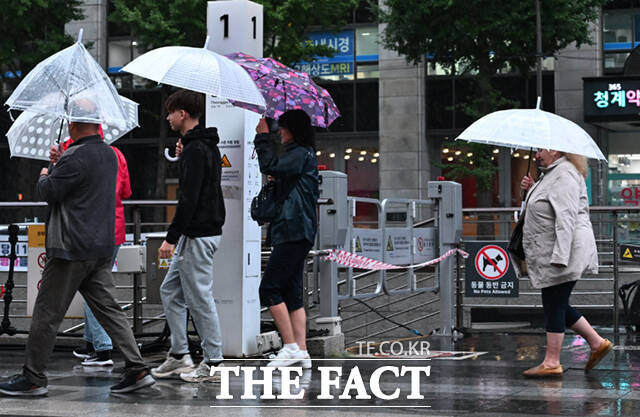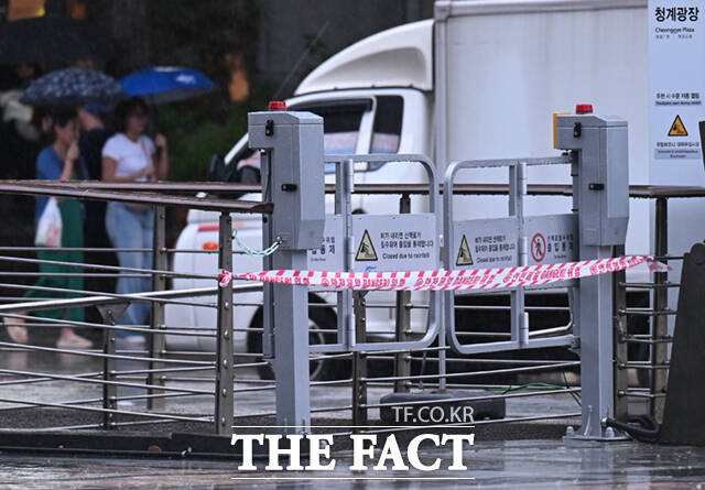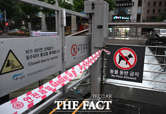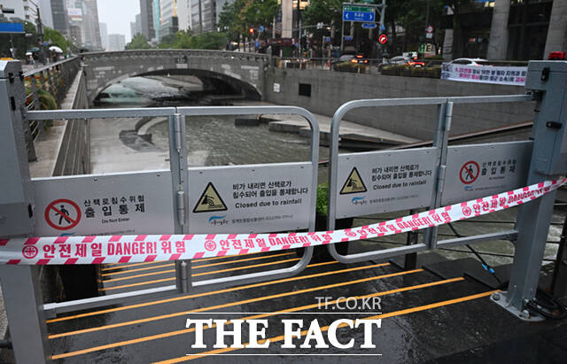 [더팩트ㅣ이새롬 기자] 중부지방을 중심으로 전국에 비가 내리는 13일 오전 서울 청계천 산책로 출입이 통제돼 있다.