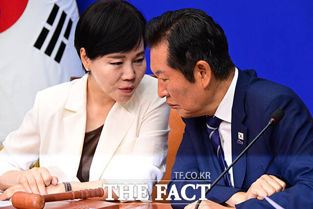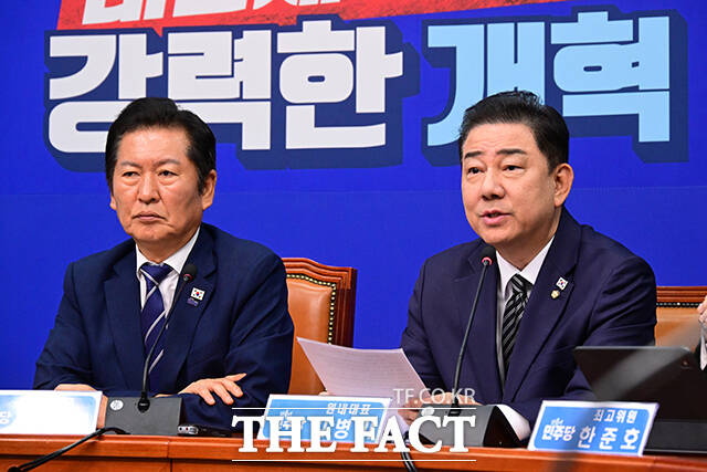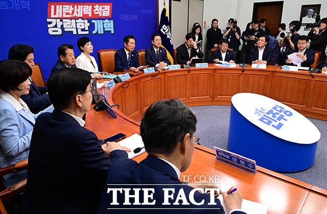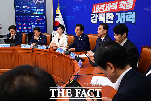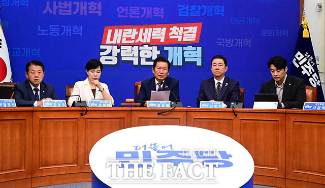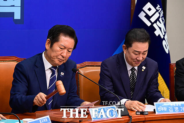 [더팩트ㅣ국회=남윤호 기자] 정청래 더불어민주당 대표(가운데)가 13일 오전 서울 여의도 국회에서 열린 최고위원회의에서 권성동 국민의힘 의원이 통일교 소유의 골프장에 방문하는 영상을 시청하고 있다.
