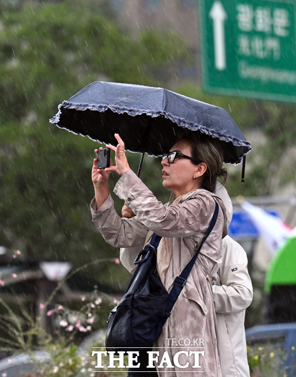 [더팩트ㅣ이새롬 기자] 중부지방을 중심으로 전국에 비가 내리는 13일 오전 서울 광화문 일대에서 외국인 관광객이 우산을 쓴 채 자신의 휴대전화로 도심을 촬영하고 있다.