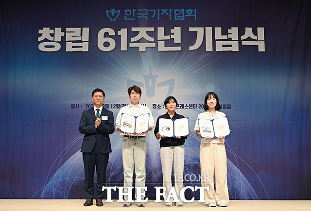 [더팩트ㅣ서예원 기자] 박성호 방송기자연합회 회장(왼쪽)이 12일 서울 중구 한국프레스센터 국제회의장에서 열린 '한국기자협회 창립 61주년 기념식'에 참석해 '한국기자협회와 나' 사진 공모전 우수상을 시상한 뒤 수상자들과 기념촬영을 하고 있다.yennie@tf.co.kr사진영상기획부 photo@tf.co.kr