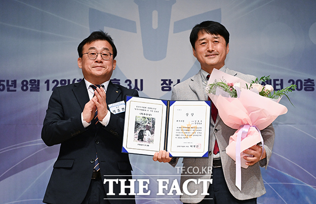 [더팩트ㅣ서예원 기자] 박종현 한국기자협회 회장(왼쪽)이 12일 서울 중구 한국프레스센터 국제회의장에서 열린 '한국기자협회 창립 61주년 기념식'에 참석해 '한국기자협회와 나' 사진 공모전 최우수상을 시상한 뒤 김동수 경상일보 기자와 기념촬영을 하고 있다.