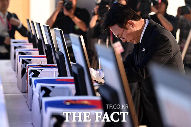 [더팩트ㅣ임영무 기자] 김민석 국무총리가 13일 오전 서울 동작구 현충원 현충관에서 열린 광복 80주년 독립유공자 유해봉환식에서 건국훈장을 헌정하고 있다.