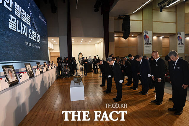 [더팩트ㅣ임영무 기자] 김민석 국무총리가 13일 오전 서울 동작구 현충원 현충관에서 거행된 광복 80년, 독립유공자 유해봉환식에 참석해 헌화 및 분향을 하고 있다.