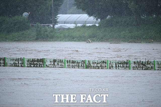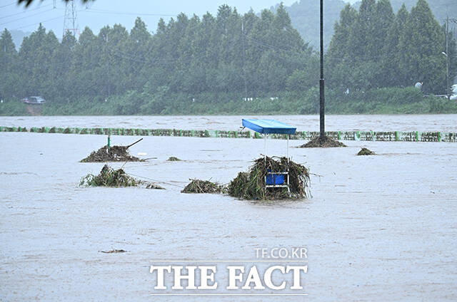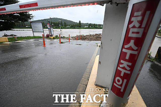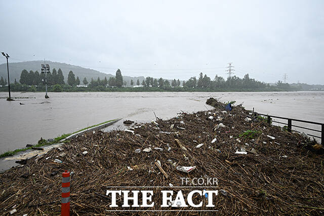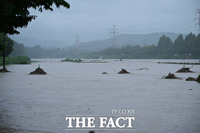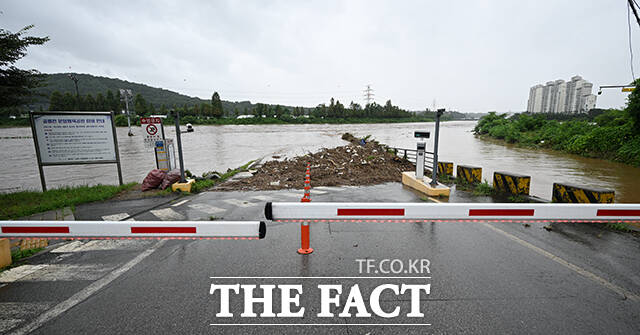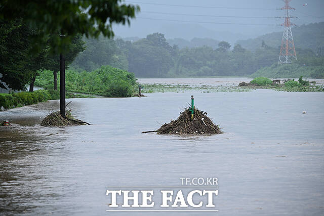 [더팩트ㅣ고양=박헌우 기자] 중부지방을 중심으로 호우특보가 내려진 13일 오후 경기 고양시 덕양구 공릉천 문화체육공원이 물에 잠겨있다.