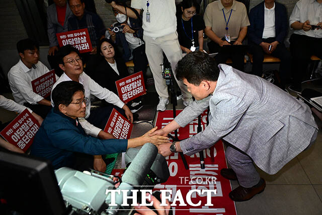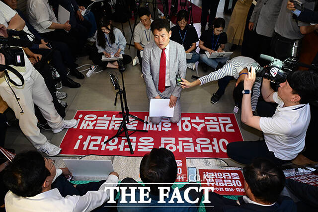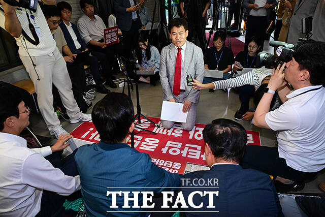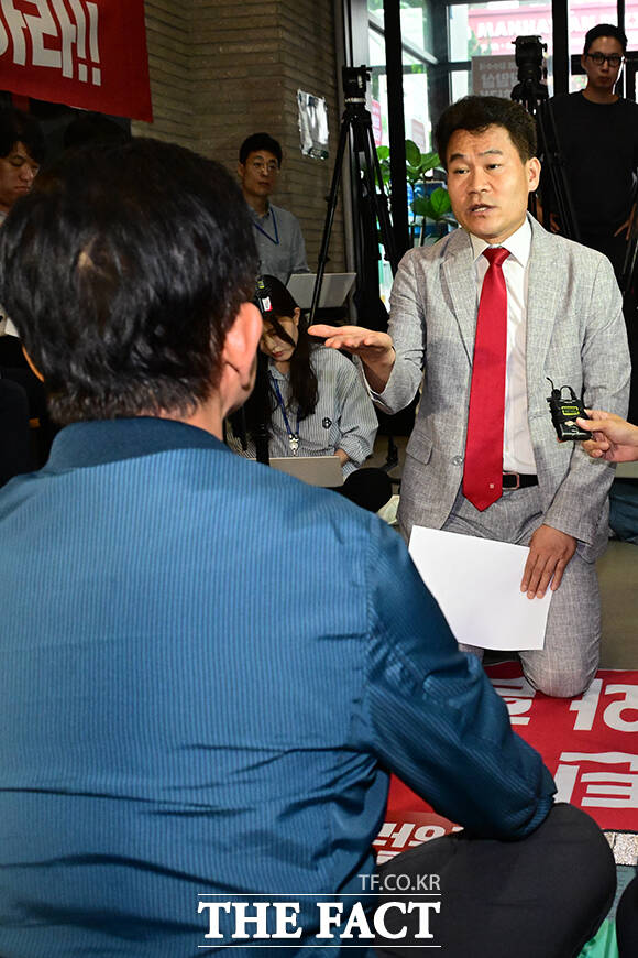 중앙윤리위원회의에 출석해 자신의 징계 여부에 대한 소명을 마친 전한길 씨가 국민의힘 당사 특검 압수수색 저지를 위해 농성 중인 김문수 당대표 후보(왼쪽) 앞에 무릎을 꿇고 징계에 대한 입장을 밝히고 있다.