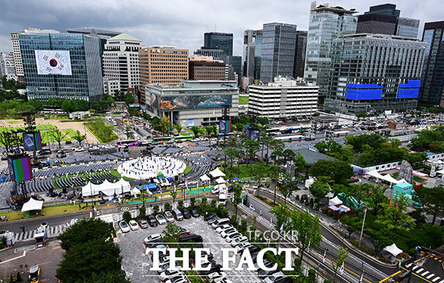 [더팩트ㅣ임영무 기자] 제80주년 광복절 경축행사 전야제를 앞둔 14일 오후 서울 광화문광장에는 '함께 찾은 빛, 대한민국을 비추다' 경축 행사 리허설이 진행되고 있다. darkroom@tf.co.kr사진영상기획부 photo@tf.co.kr