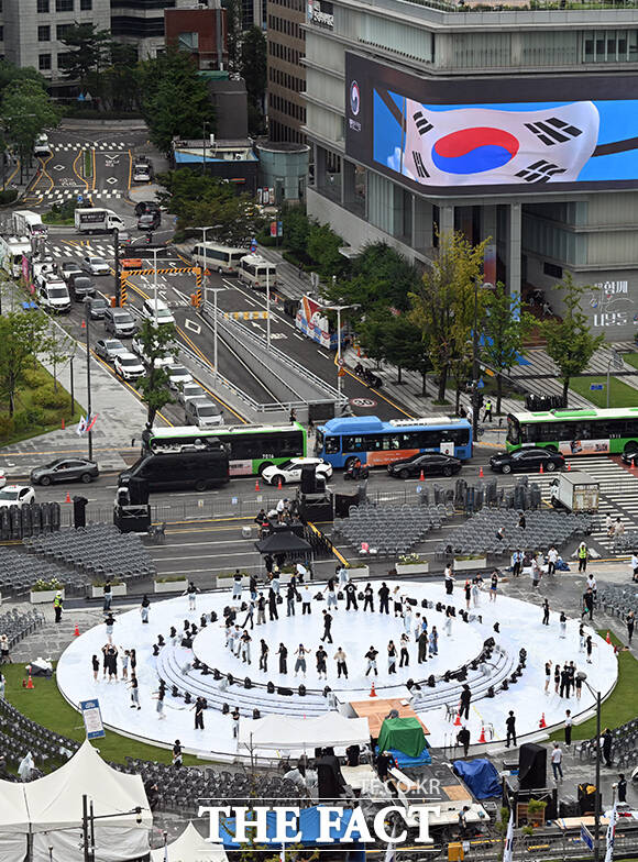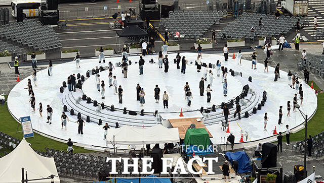 [더팩트ㅣ임영무 기자] 제80주년 광복절 경축행사 전야제를 앞둔 14일 오후 서울 광화문광장에 마련된 무대에서 관계자들이 기념공연 리허설을 하고 있다.