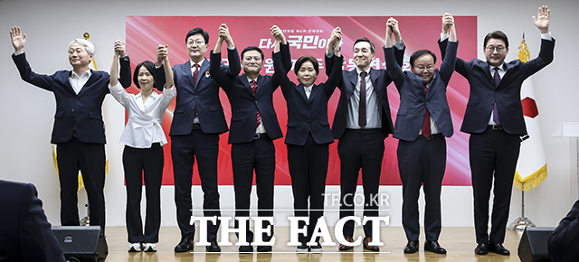 [더팩트ㅣ남윤호 기자] 국민의힘 최고위원 후보들이 14일 오후 서울 여의도 국민의힘 중앙당사에서 열린 제6차 전당대회 수도권·강원·제주 합동연설회에서 기념촬영을 하고 있다. 왼쪽부터 김근식, 최수진, 손범규, 김태우, 양향자, 김민수, 김재원, 신동욱 최고위원 후보. ilty012@tf.co.kr 사진영상기획부 photo@tf.co.kr