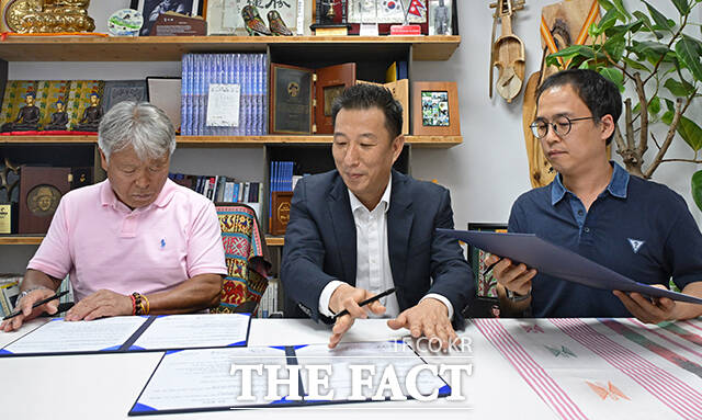 [더팩트ㅣ임영무 기자] 엄홍길 엄홍길휴먼재단 상임이사, 이명환 중국 유니버셜트립 이사, 백민우 여행을만들다 대표가 14일 서울 종로구 엄홍길휴먼재단에서 한·중 국제 트레킹 관광 활성화 및 기부 문화 확산을 위한 업무협약을 체결하고 있다.
