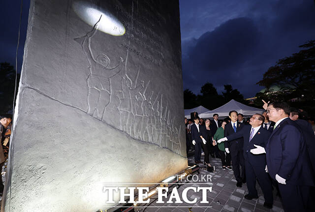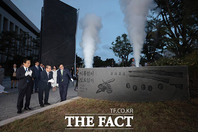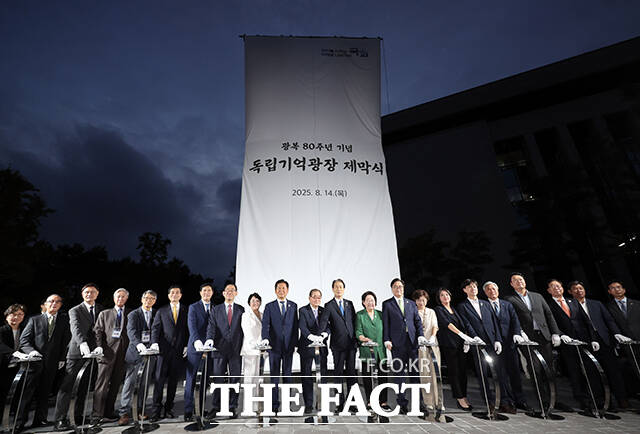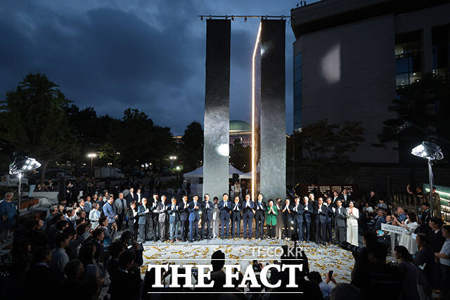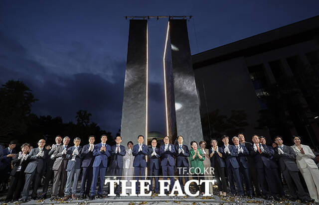 [더팩트ㅣ남윤호 기자] '독립기억광장'의 제막식이 열린 14일 오후 서울 여의도 국회 도서관 앞에서 우원식 국회의장과 정청래 더불어민주당 대표, 이종찬 광복회장, 권오을 국가보훈부 장관, 독립운동가 후손들이 '빛의 길'을 제막하며 박수를 치고 있다.