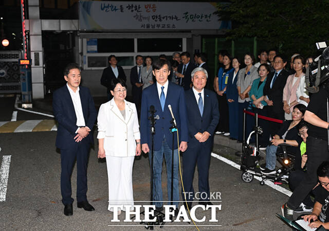 [더팩트ㅣ이새롬 기자] 조국 전 조국혁신당 대표가 15일 오전 서울 구로구 남부교도소에서 광복절 특별 사면으로 출소해 대국민 메시지를 발표하고 있다.