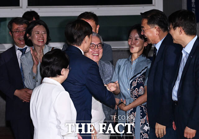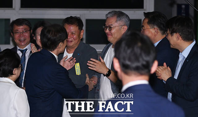 [더팩트ㅣ이새롬 기자] 조국 전 조국혁신당 대표가 15일 오전 서울 구로구 남부교도소에서 광복절 특별 사면으로 출소해 같이 사면된 최강욱 전 더불어민주당 의원과 인사하고 있다.