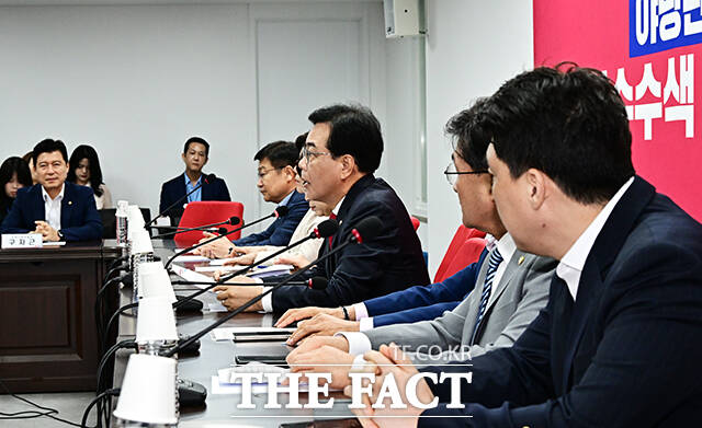 [더팩트ㅣ배정한 기자] 송언석 국민의힘 비상대책위원장 겸 원내대표(오른쪽)가 18일 오전 서울 여의도 중앙당사에서 열린 비상대책위원회의에 참석해 모두발언을 하고 있다.