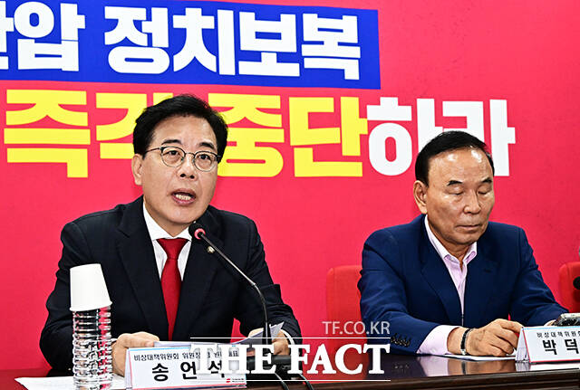 송 비대위원장은 이날 김건희 특검의 국민의힘 당사 압수수색 시도에 대해 "당원의 이름, 주민등록번호, 전화번호뿐만 아니라 심지어 계좌번호까지 담겨있는 500만 당원의 핵심정보를 탈취하겠다는 것은 개인정보 강탈이자 야당·국민 사찰"이라며 "국민의힘 당원 전체를 잠재적 범죄자로 취급하는 반인권적 야당 탄압 압수수색에는 일절 협조할 수 없다"고 말했다.