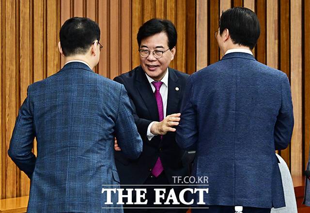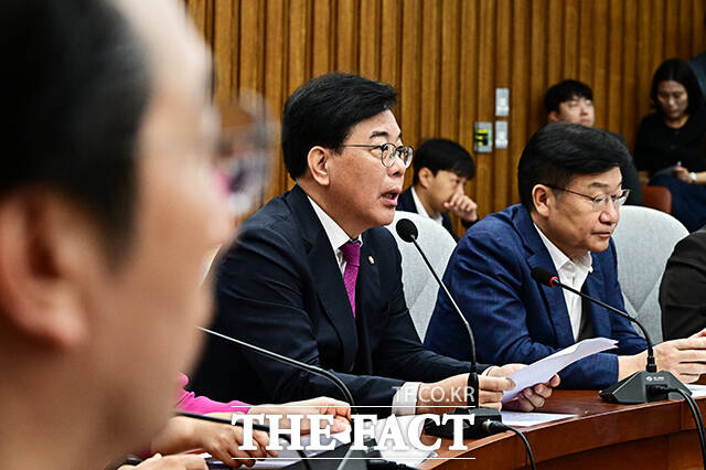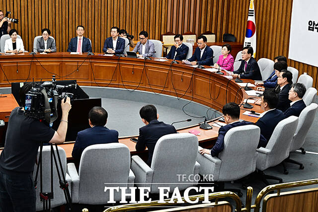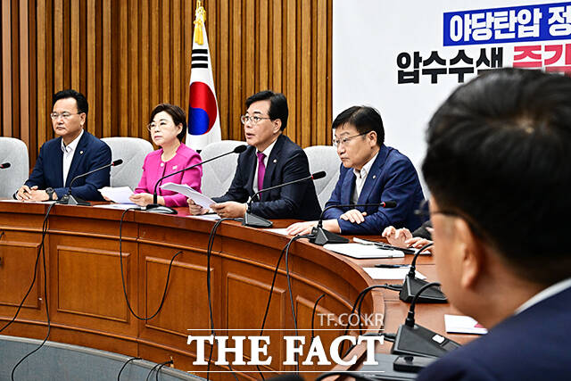 [더팩트ㅣ국회=배정한 기자] 송언석 국민의힘 비상대책위원장 겸 원내대표가 19일 오전 서울 여의도 국회에서 열린 원내대책회의에 참석해 모두발언을 하고 있다.