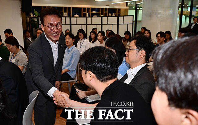 [더팩트ㅣ임영무 기자] 김민석 국무총리(왼쪽)가 19일 오전 서울 종로구 정부서울청사에서 열린 출입기자단 간담회에 참석해 인사를 나누고 있다.